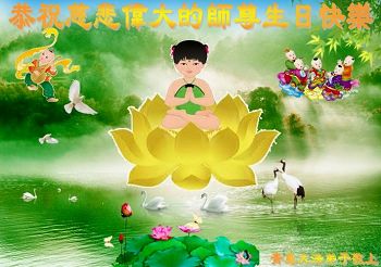 小组全体大法弟子跪拜恭祝师父生日快乐!谨记师父的教诲,尽心竭力配合整体,遇事向内找,做好三件事,决不辜负师尊对大法弟子的厚望。再次跪拜师父! 仙女散花龙凤舞 无边佛恩荡洪微 香炉烟飞表寸心 谨记师命勿懈怠 市井穿梭救人忙 风雨无阻送真相 不觉金身渐已成 无语跪拜师恩洪 山东省青岛大法弟子恭祝师尊生日快乐!普天同庆世界法轮大法日!