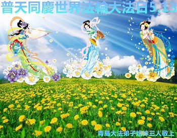 弟子感谢伟大师尊的慈悲救度,有幸能成为大法弟子!弟子要做好三件事,多救人,谢师恩!叩拜恩师! 山东省青岛大法弟子姐妹三人普天同庆世界法轮大法日!