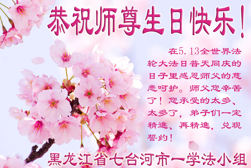 【明慧网二零一六年五月九日】 黑龙江省七台河市一学法小组大法弟子恭祝师尊生日快乐!