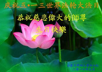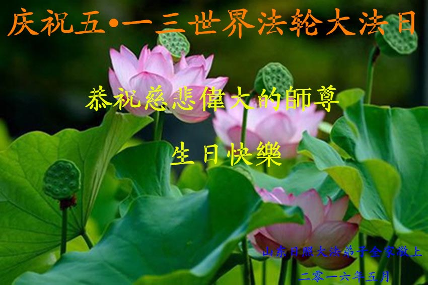 山东威海乳山一讲真相小组大法弟子恭贺世界法轮大法日,恭祝师父生日快乐。 师父辛苦了,弟子们想念您! 山东聊城一家三口大法弟子恭贺世界法轮大法日及恭祝师尊华诞!