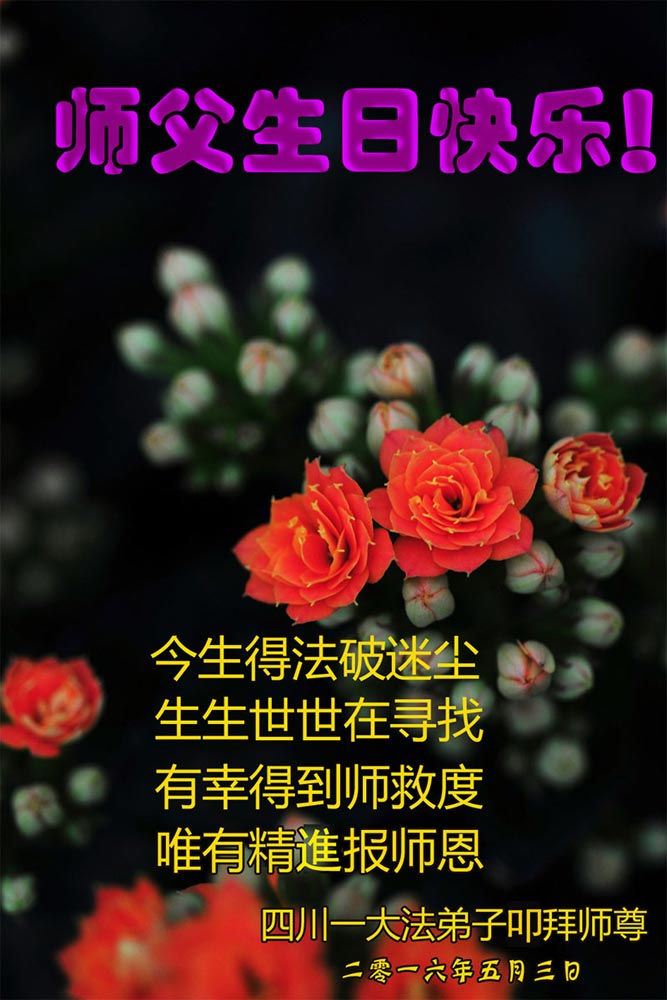 师父辛苦了!在正法的最后时刻,我们一定要学好法,向内找,修好自己,救度众生,完成史前大愿,圆满随师还,谢谢师父! 2016年5月3日敬上 辽宁昌图大法弟子恭祝师父生日快乐!