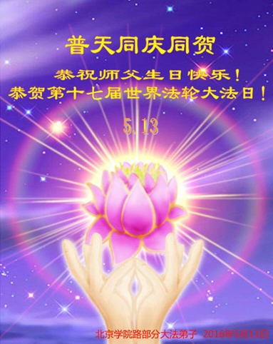 普天同庆五一三 世界各地发信函 感恩师尊慈悲度 身心受益快乐伴 法轮大法驻心间 真善忍甘露浇灌 道德升华陋习变 世界各族都赞叹 北京学院路部份大法弟子恭祝师父生日快乐!恭贺第十七届世界法轮大法日!