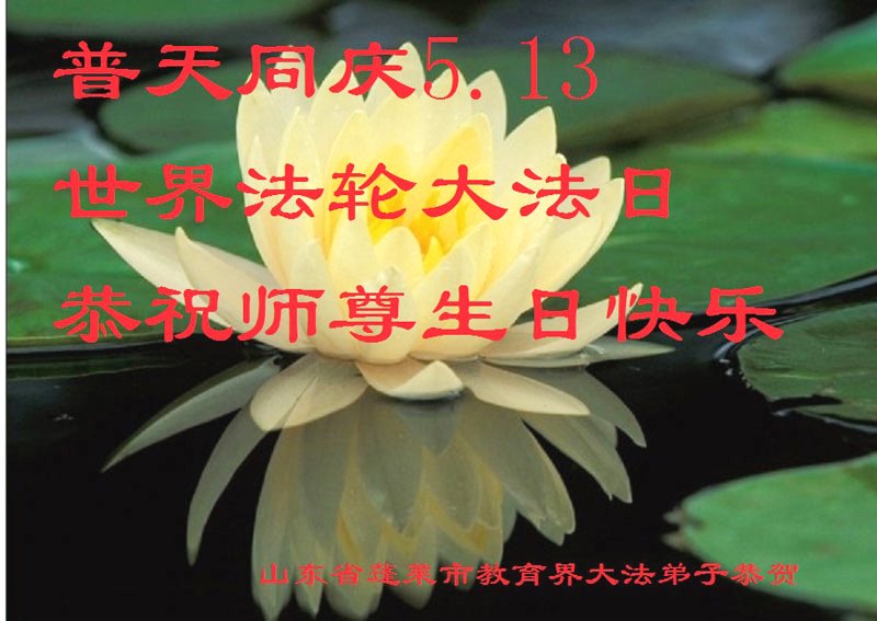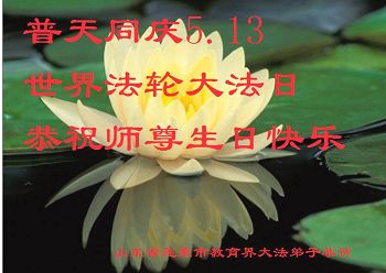 五月十三华诞来 贺词贺卡飞海外 感恩师尊慈悲怀 弟子欲语难表白 得法顽疾顿消退 身轻体健乐开怀 时刻牢记真善忍 法轮大法记心怀 师尊时时慈悲护 弟子救人正念足 助师正法兑誓愿 唯愿师尊笑颜驻 山东省烟台市蓬莱市教育界大法弟子恭祝师尊生日快乐!普天同庆世界法轮大法日!