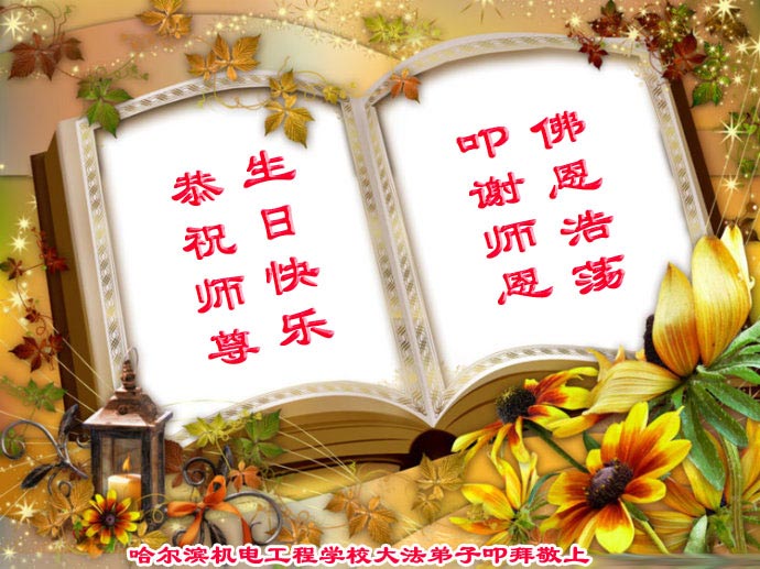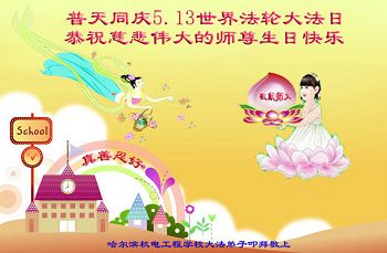 【明慧网二零一六年五月九日】 黑龙江省哈尔滨机电工程学校大法弟子恭祝慈悲伟大的师尊生日快乐!
