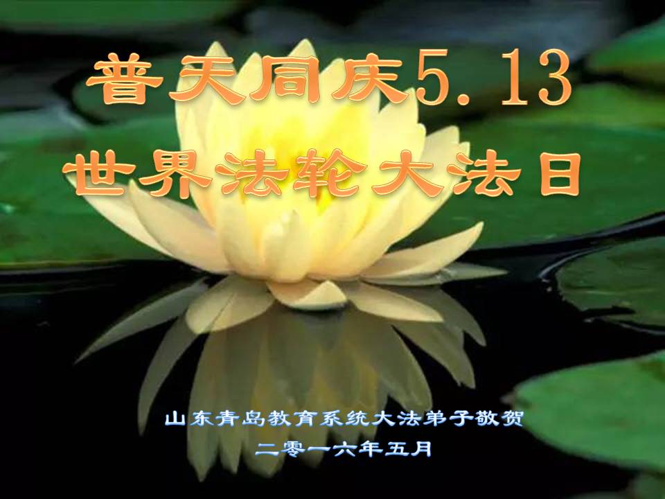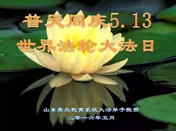 法光慈悲耀寰宇 普天同庆颂洪恩 在五·一三世界法轮大法日到来之际,北京清华大学大法弟子向至尊至敬、至高无上、慈悲伟大的师父致以最崇高的敬意! 我们无比感恩慈悲伟大师尊的慈悲救度。在法轮大法的佛光普照下,我们有幸得法,在大法中修炼,成为伟大师尊的弟子,无上荣耀。在此我们恭祝慈悲伟大师尊生日快乐!颂祝慈悲伟大师尊万寿永无疆! 北京清华大学大法弟子合十 敬拜恩师 山东青岛教育系统大法弟子恭贺世界法轮大法日!
