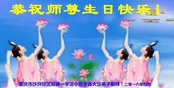 沙坪坝土塆大法弟子全家敬上 重庆沙坪坝小龙坎全体大法弟子恭祝师父生日快乐!恭祝世界法轮大法日!