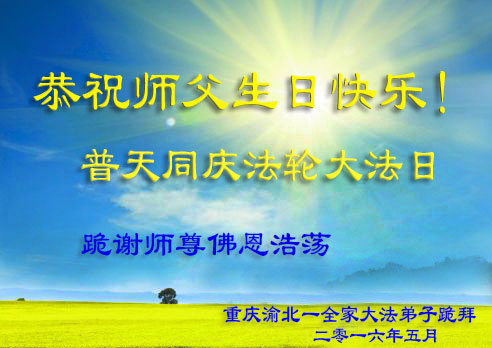 一晃又是师尊生日和法轮大法日来临!可是这一晃里,却是恩师为弟子和宇宙众生的巨大承受与付出。弟子能平稳的走到今天,感恩师父的精心呵护和慈悲苦度。在这修炼不太多的时间里,弟子更加信师信法,精進实修,做好三件事,追着与师父回家。 叩拜慈悲伟大的师父辛苦了! 祝贺第十七个伟大的法轮大法日 重庆市开县大法弟子祝贺 二零一六年四月二十一日 重庆渝北区大法弟子恭祝慈悲伟大的师尊生日快乐!恭贺世界法轮大法日!