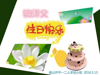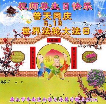 【明慧网二零一六年五月九日】 河北唐山丰润区一学法小组大法弟子恭祝师尊生日快乐!恭贺法轮大法日!