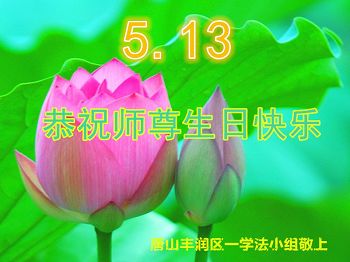 我们是河北省唐山市开平区的一个学法小组,时光匆匆,转眼又到了五月十三日世界法轮大法日,也是我们伟大师父的生日,我们小组全体学员向师父表达我们多年来对师父深深的敬意和思念,并向师父问好,同时送去我们最衷心的恭祝我们慈悲伟大的师父生日快乐! 我们学法小组共有五名学员,其中三人是老年的学员。在没学大法之前,都是患有各种疾病,整天被病痛折磨的死去活来的。自从修炼了法轮大法,全都象变了一个人,身体都有了很大的改观,人也精神了,真是无病一身轻啊。是师父把我们从地狱里捞出来,给我们洗净,教我们学法炼功,修心性,时时刻刻呵护着我们,带我们走在神的路上。 在今后的修炼中,我们一定要听师父的话,修好自己,做好三件事,兑现史前的誓约。 河北省唐山区及玉田两位大法弟子恭祝慈悲伟大的师尊生日快乐!