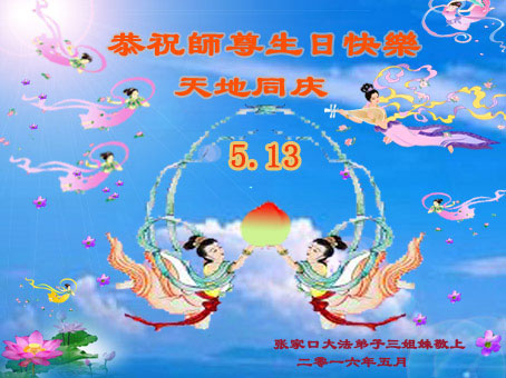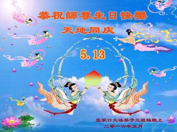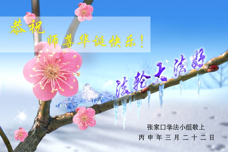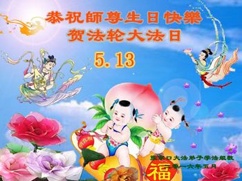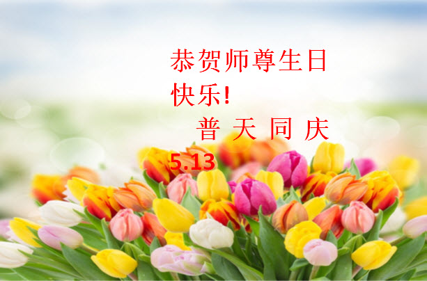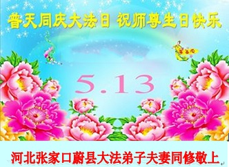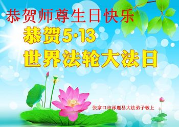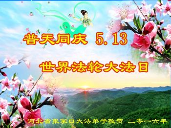 5月13日是世界法轮大法日,也是师父的生日,弟子在这里衷心的祝师父生日快乐!心想事成,弟子修炼法轮大法金刚不动,坚如磐石,把师父交代的三件事做好,多救人。在以后的日子里,真正做到实修自己,提高心性,提高自己的层次。谢谢师父救度之恩! 河北省张家口市全体大法弟子恭祝慈悲伟大的师父生日快乐!庆祝世界法轮大法日!
