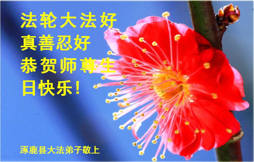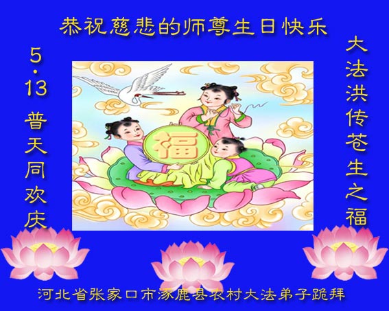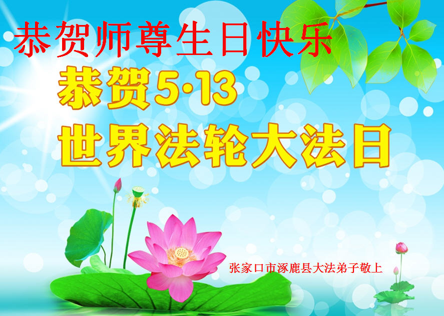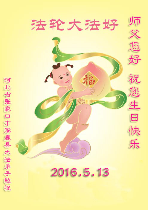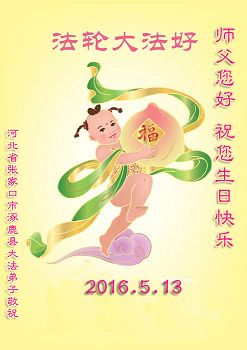 【明慧网二零一六年五月九日】 河北省张家口市涿鹿县大法弟子恭祝师尊生日快乐!恭贺世界法轮大法日!