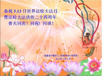 福建省宁德市屏南县大法弟子与家人感谢师尊的慈悲苦度,敬祝师父生日快乐!祝贺世界法轮大法日! 2016年4月25日 福建省福州一大法弟子恭祝师尊华诞暨世界法轮大法日!