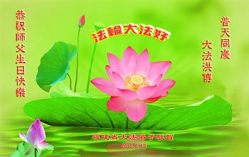 尘世的污浊挡不住弟子们返本归真的心, 邪恶的疯狂吓不倒大法徒对大法的坚信与坚定! 师尊的慈悲、伟大 让弟子们无法表达对师尊与法的感恩! 我们唯有坚定地兑现自己的誓约: 把大法的洪恩与福音带给被邪*党-欺骗下的世人!让更多世人被大法救度! …… 福建省福州一学法小组大法弟子恭祝师尊生日快乐!普天同庆世界法轮大法日!
