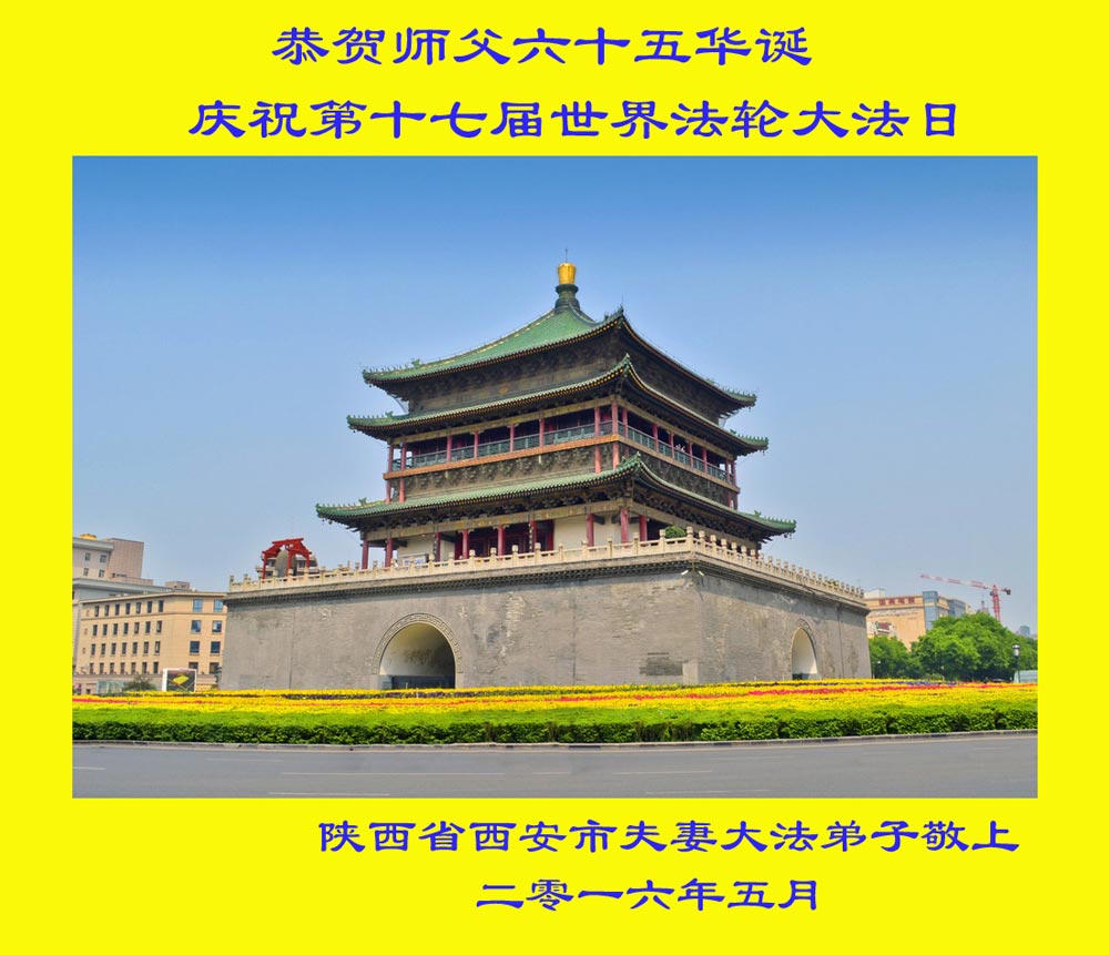 恭贺师父六十五华诞!庆祝第十七届世界法轮大法日! 陕西省西安市夫妻大法弟子敬上 二零一六年五月 陕西安康全体大法弟子恭祝慈悲伟大的师尊华诞!