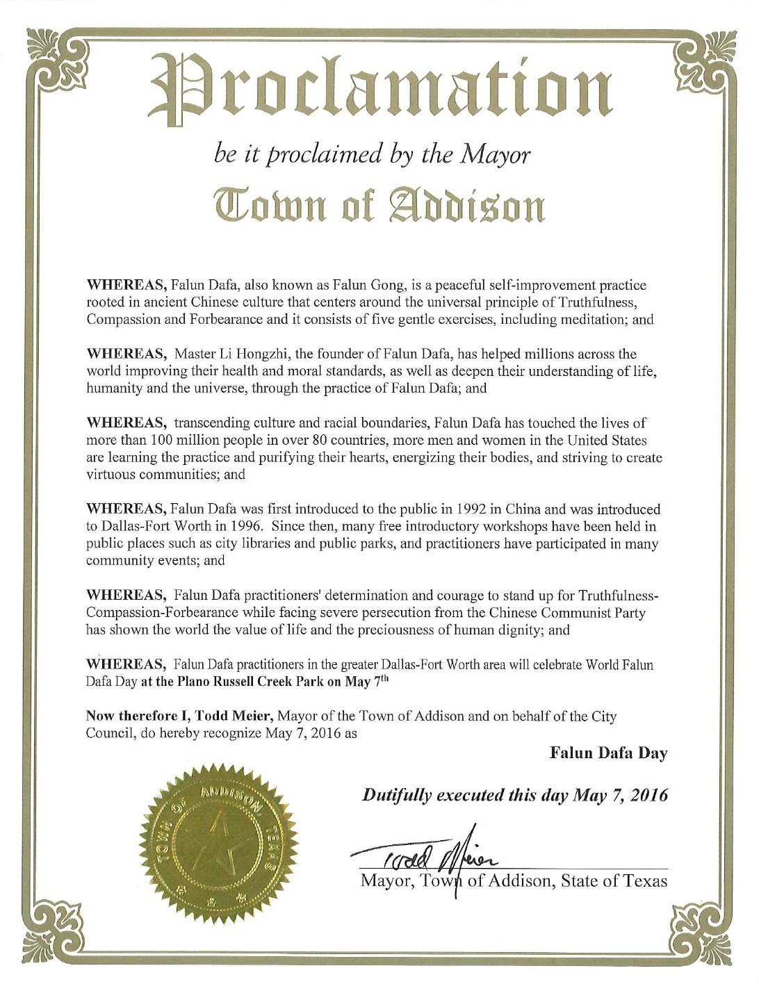 译文: 艾迪逊市长褒奖令 鉴于,法轮大法,又称法轮功,源于古老中国文化,是以宇宙特性“真、善、忍”为原则的一个平和、自我提高的功法,它由五套功法组成,包括打坐; 鉴于,法轮大法创始人李洪志先生,已经帮助全世界上亿的人改善了身体的健康,提高了道德,同时,通过修炼法轮大法,使他们加深了对生命、人生、以及宇宙的认识; 鉴于,法轮大法超越文化和种族的界限,在全世界八十多个国家吸引了上亿人们修炼法轮功。在美国越来越多的男子、妇女在学功,净化心灵,精力充沛,并使社区道德回升; 鉴于,法轮大法从一九九二年在中国传出,一九九六年法轮大法洪传到达拉斯-沃思堡。从那时起,在的许多图书馆、公园举办了许多期免费法轮大法教功班。法轮大法修炼者参加了许多社区活动; 鉴于,面对中共的残酷迫害,法轮大法学员展现出的对“真、善、忍”的坚定,向全世界展示了生命的价值和人格的尊严; 鉴于,达拉斯-沃思堡地区法轮大法学员五月七日在布兰诺市Russell Creek公园庆祝世界法轮大法日; 鉴此,我,陶德·密伊尔(Todd Meier),艾迪逊市市长代表市议会,宣布二零一六年五月七日为“法轮大法日” |