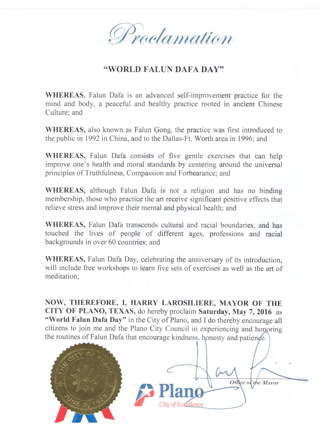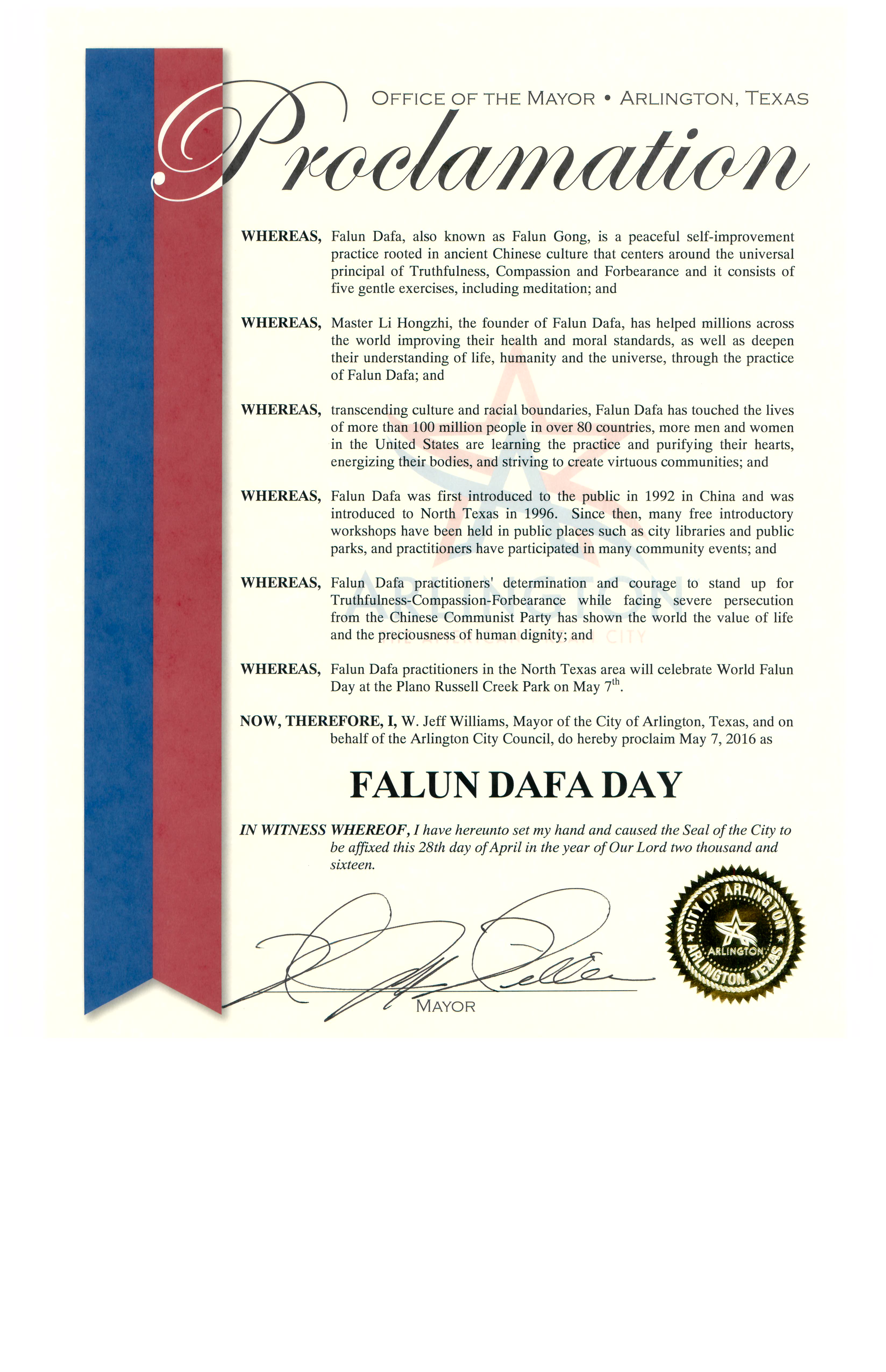 译文: 褒奖令 世界法轮大法日 鉴于,法轮大法是一种源于古老中国文化、促进人的身心健康,平和的、有益的自我修炼、提高的高层次功法。 鉴于,法轮大法又称法轮功,于一九九二年在中国大陆传出,一九九六年传入达拉斯-沃思堡地区。 鉴于,法轮大法的五套舒缓的功法,可以帮助以宇宙特性真、善、忍为准则修炼的人们改进身体的健康和道德的提升。 鉴于,虽然法轮大法不是宗教,也没有会员制,却对修炼者产生了巨大的正面影响及效果,减轻了压力,改善了他们身体和精神的健康。 鉴于,法轮大法超越文化和种族的界限,已经传到了六十多个国家的不同年龄、职业和种族的人们。 鉴于,法轮大法日,是每年一度的庆祝他传出的日子,包括免费教炼五套优美的功法。 现在,因此,我,拉瑞·劳瑞斯利锐 ,布兰诺市市长,在此宣布星期六,二零一六年五月七日为布兰诺市的“世界法轮大法日“,并且我鼓励所有的居民与我和市议会一起体验、表彰法轮大法所提倡的善良、真诚和忍耐。 阿灵顿市(City of Arlington) 宣布法轮大法日  图2:阿灵顿市市长宣布法轮大法日的褒奖令 |