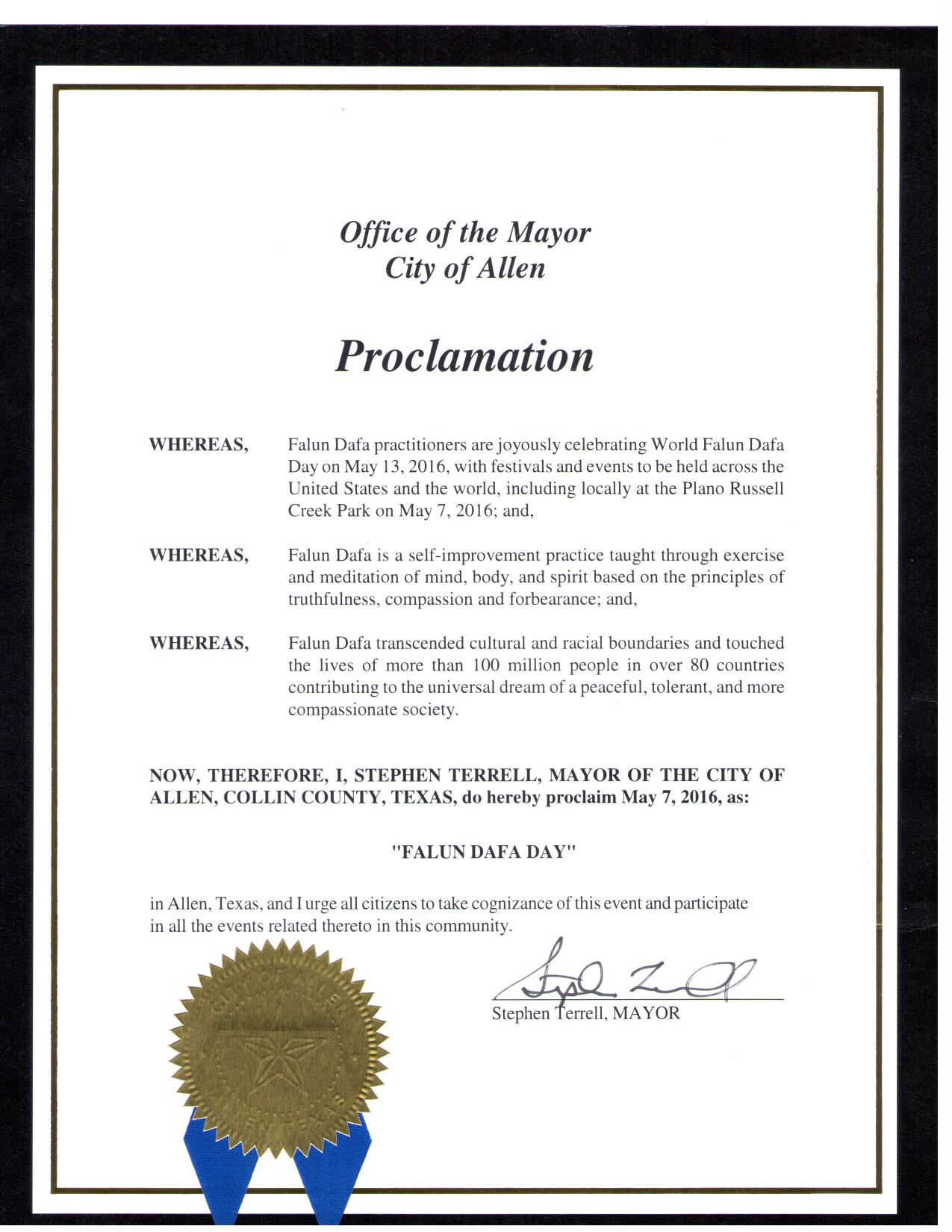 译文: 鉴于,法轮大法,又称法轮功,源于古老中国文化,是以宇宙特性“真、善、忍”为原则的一个平和、自我提高的功法,它由五套功法组成,包括打坐; 鉴于,法轮大法创始人李洪志先生,已经帮助全世界上亿的人改善了身体的健康,提高了道德,同时,通过修炼法轮大法,使他们加深了对生命、人生、以及宇宙的认识; 鉴于,法轮大法超越文化和种族的界限,在全世界八十多个国家吸引了上亿人们修炼法轮功。在美国越来越多的人们通过学炼法轮功,使他们心灵得到纯净,身体健康,并为社区道德的回升起着积极的作用; 鉴于,法轮大法一九九二年在中国传出,一九九六年法轮大法洪传到北德克萨斯州。从那以后,在的许多图书馆、公园举办了许多期免费法轮大法教功班。法轮大法修炼者参加了许多社区活动; 鉴于,面对中共的残酷迫害,法轮大法学员展现出的对“真、善、忍”的坚定,向全世界展示了生命的价值和人格的尊严; 鉴于,达拉斯-沃思堡地区法轮大法学员五月七日在布兰诺市Russell Creek公园庆祝世界法轮大法日; 鉴此,我,杰夫·威廉穆斯(Jeff Williams),德州阿灵顿市市长代表市议会,宣布二零一六年五月七日为“法轮大法日” 艾伦市(City of Allen) 宣布法轮大法日  图3:艾伦市市长宣布法轮大法日的褒奖令 |