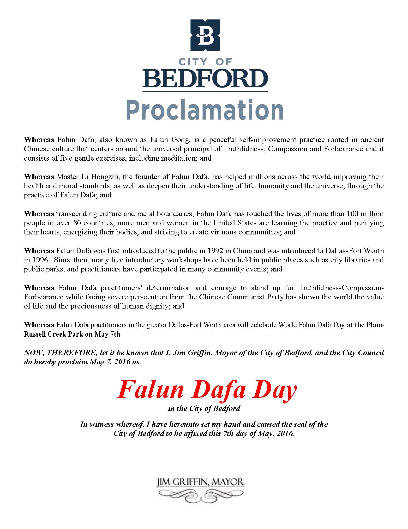 译文 褒奖令 鉴于,在美国以及全世界各地的法轮大法学员将满怀喜悦以各种形式的活动来庆祝二零一六五月十三日世界法轮大法日,包括我们地区在五月七日于布兰诺Russell Creek公园的庆祝活动; 鉴于,法轮大法以宇宙“真、善、忍”特性为准则,是性命双修的自我提升功法; 鉴于,法轮大法超越文化和种族的界限,在全世界八十多个国家吸引了上亿人们修炼法轮功,把平和、宽容、慈悲的普世价值观带给全社会; 因此,我,史蒂夫·泰瑞尔(Stephen Terrell),艾伦市市长宣布二零一六年五月七日为“法轮大法日” 伯德福特市 (City of Bedford) 宣布法轮大法日  图4:伯德福特市市长宣布法轮大法日的褒奖令 |