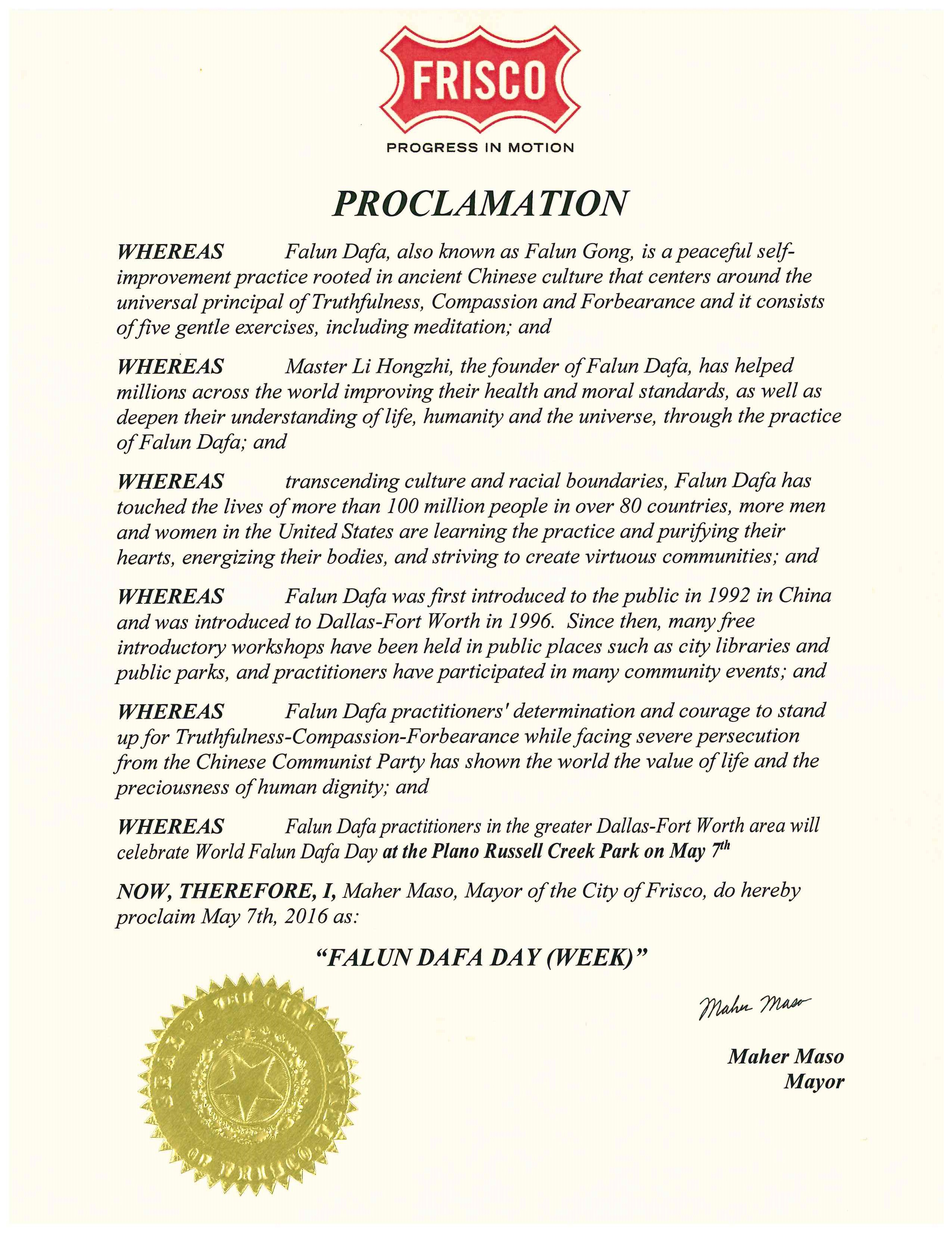 译文: 鉴于,法轮大法(法轮功)源于古老中国文化,是以宇宙特性“真善忍”为原则的一个平和的自我提高的功法。法轮功共有五套功法,包括打坐修炼在内; 鉴于,法轮大法创始人李洪志先生帮助了全世界上亿人增强身心健康,以及使他们通过修炼法轮功加深了对生命、人生、以及宇宙的认识; 鉴于,法轮大法超越文化和种族的界限,在全世界八十多个国家吸引了上亿人们修炼法轮功。在美国越来越多的人们通过学习法轮功,使他们心灵得到纯净,身体健康,并为社区道德的回升起着积极的作用。 鉴于,法轮大法从一九九二年在中国传出。一九九六年法轮大法洪传到达拉斯-沃思堡地区。从那以后,在达福地区许多图书馆、公园举办了许多期免费法轮大法教功班。法轮大法修炼者参加了许许多多社区活动; 鉴于,面对中共的残酷迫害,法轮大法学员展现出的对“真、善、忍”的坚定信念,向全世界展示了生命的价值和人格的尊严; 鉴于,达拉斯-沃思堡地区法轮大法学员五月七日将在布兰诺Russell Creek公园庆祝世界法轮大法日。 因此,我,吉姆·格里芬,伯德福特市市长及市议会,宣布二零一六年五月七日为“法轮大法日” 弗瑞斯科市 (City of Frisco) 宣布‘法轮大法日’  图5:弗瑞斯科市市长宣布法轮大法日的褒奖令 |