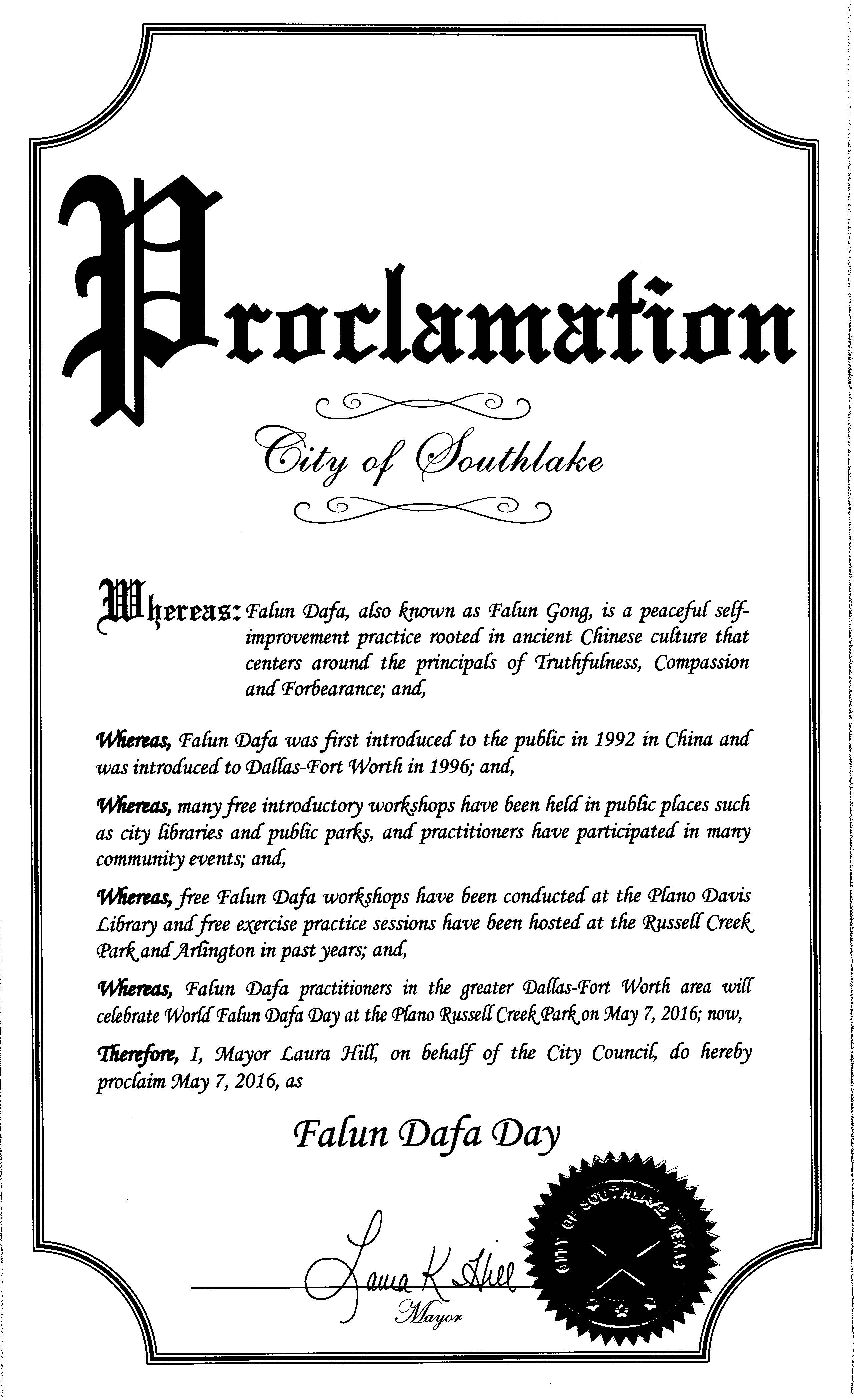 译文: 鉴于,法轮大法(法轮功),源于古老中国文化,是以宇宙特性“真、善、忍”为原则的一个平和的自我提高的功法。法轮功共有包括打坐修炼在内的五套功法; 鉴于,法轮大法创始人李洪志先生帮助全世界上亿的人增强身心健康。他们通过修炼法轮功加深了对生命、人生、以及宇宙的认识; 鉴于,法轮大法超越文化和种族的界限,在全世界八十多个国家吸引了上亿人们修炼法轮功。在美国越来越多的人们通过学炼法轮功,使他们心灵得到纯净,身体健康,并为社区道德的回升起着积极的作用; 鉴于,法轮大法从一九九二年在中国传出。一九九六年法轮大法弘传到达拉斯-沃思堡地区。从那以后,在达福地区的许多图书馆、公园举办了许多期免费法轮大法教功班。法轮大法修炼者参加了许多社区活动; 鉴于,面对中共的残酷迫害,法轮大法学员展现出的对“真、善、忍”的坚定,向全世界展示了生命的价值和人格的尊严; 鉴于,达拉斯-沃思堡地区法轮大法学员在五月七日在布兰诺Russell Creek公园庆祝世界法轮大法日; 鉴此,我,马赫·马索(Maher Maso),弗瑞斯科市(Frisco)市长,宣布二零一六年五月七日为弗瑞斯科市“法轮大法日”。 马赫•马索(签字) 弗瑞斯科市市长 南湖市 (City of Southlake) 宣布法轮大法日  图6:南湖市市长宣布法轮大法日的褒奖令 |