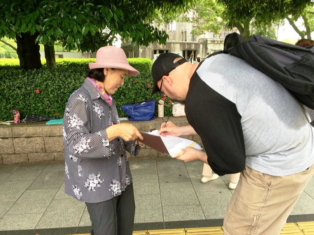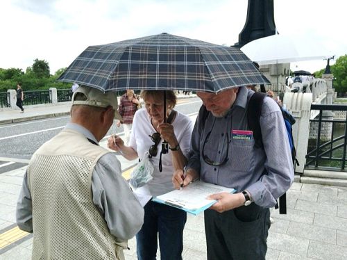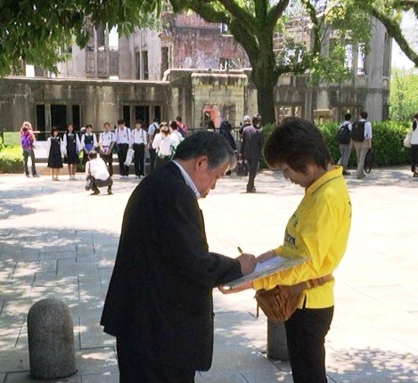 来广岛旅游的华人签名声援诉江的也不少。有的不说话,签完名就走了。有一对姐妹带着两个小女孩来签名,其中一个孩子说:我奶奶天天在家炼这个,小女孩手指着学员穿的黄背心上的法轮功的字。签完名小女孩的妈妈一边抹眼泪一边说:看看国外多好啊!可以自由炼功,活动中都有警察保护。可是在中国却那么难……希望中国能早日停止迫害。 也有明白真相的日本民众说:我听说过法轮功的事,我签名,加油! 有的在远处看到法轮功学员签名板上挂着的声援起诉江泽民的传单,直接就过来签名。