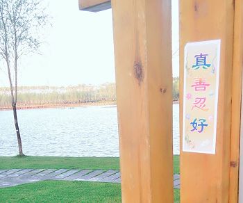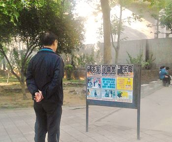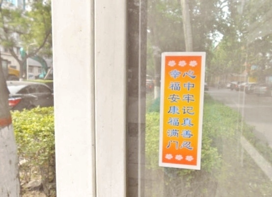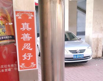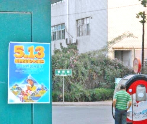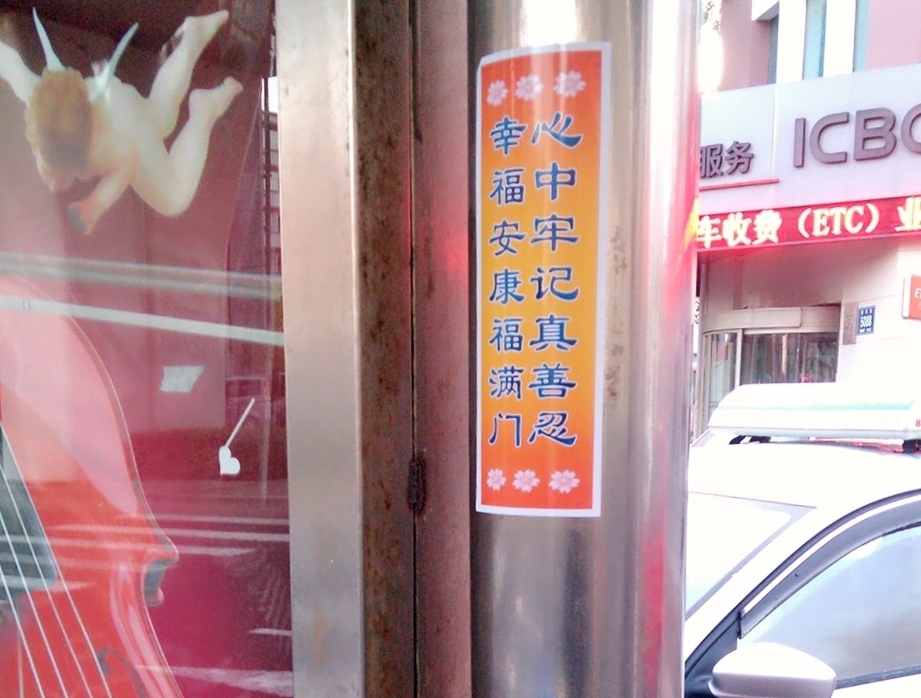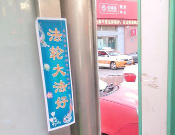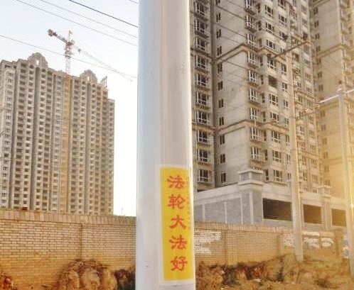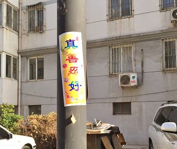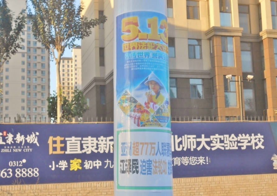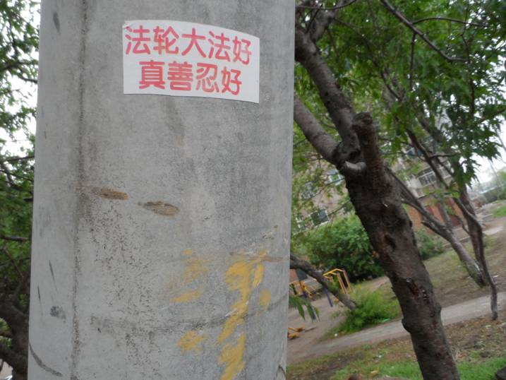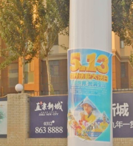 五月十三日世界法轮大法日前后,石家庄市区的法轮功真相粘贴,引来市民观看。 “法轮大法好”出现在河北保定市的大街小巷
