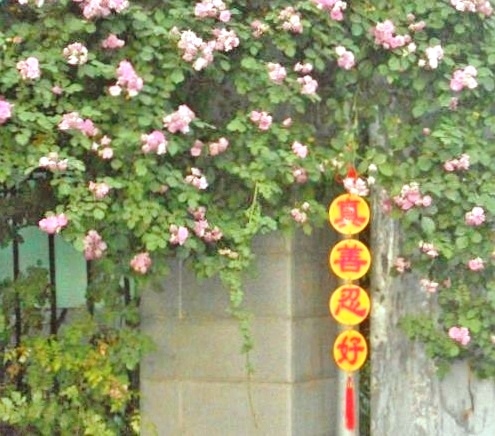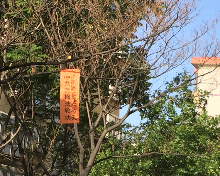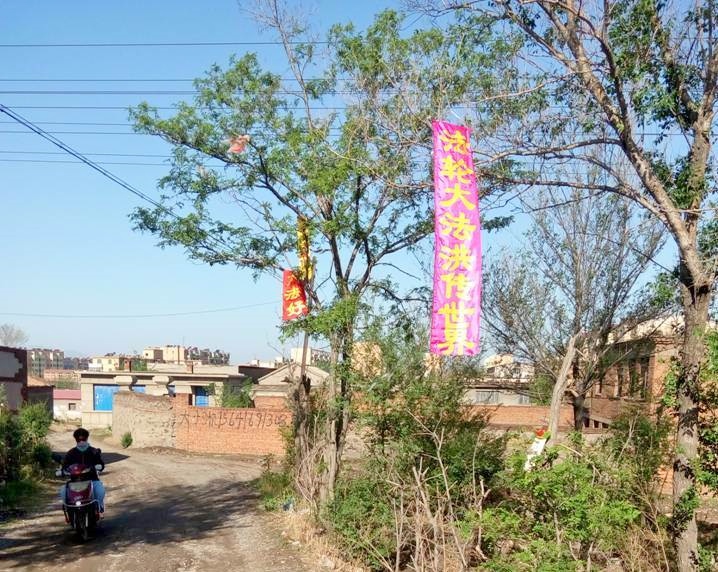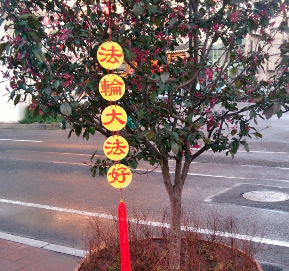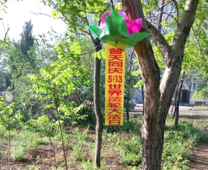 2016年5月13日是世界法轮大法日,这是辽西某地街道上可以看到悬挂的莲花、“树挂”,传播“法轮大法好”的福音。