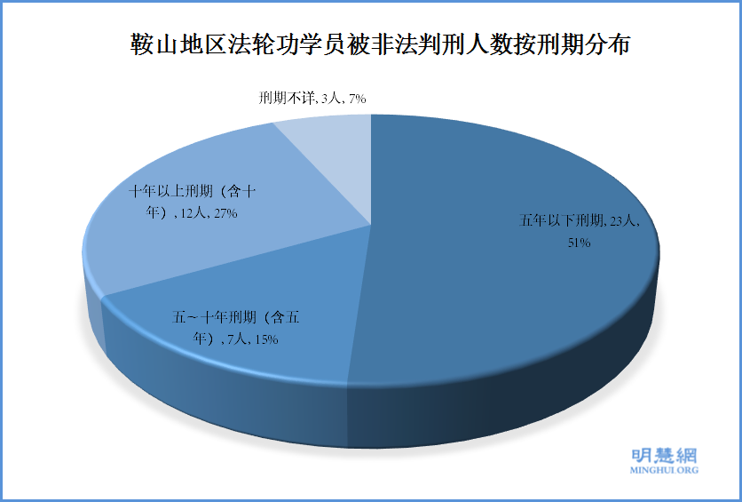 【明慧网二零一六年六月八日】(明慧网通讯员辽宁报道)据明慧网不完全统计,至二零一六年六月,鞍山市(含海城、台安、岫岩)十二位法轮功学员被非法判刑十年以上,十九位法轮功学员被非法判刑五年以上,而且这些法轮功学员目前在监狱中被迫害的严重。 图一. 鞍山市被非法判刑的法轮功学员人数按刑期统计 |