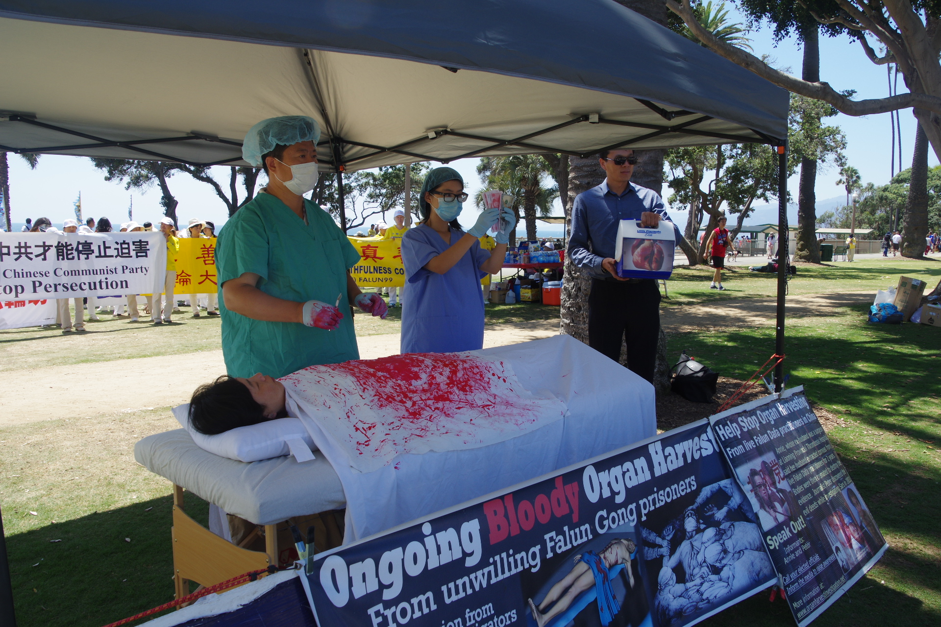 图4:法轮功学员以真人模拟展示中共活摘人体器官贩卖牟利的罪恶。 |
