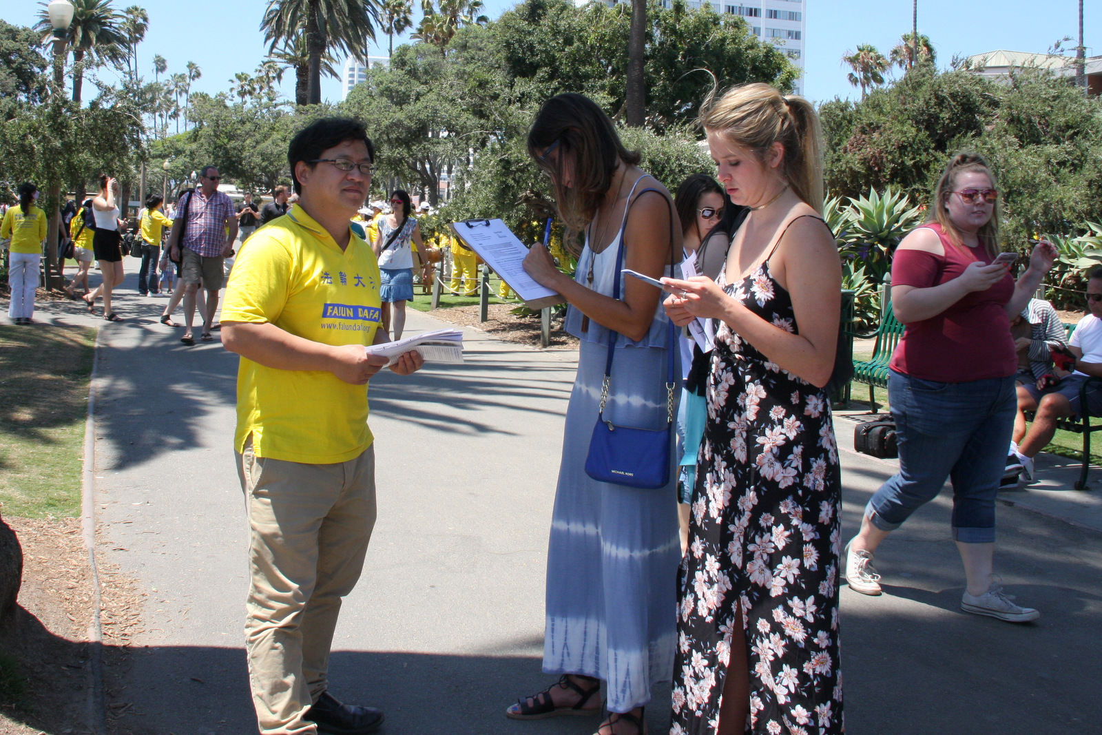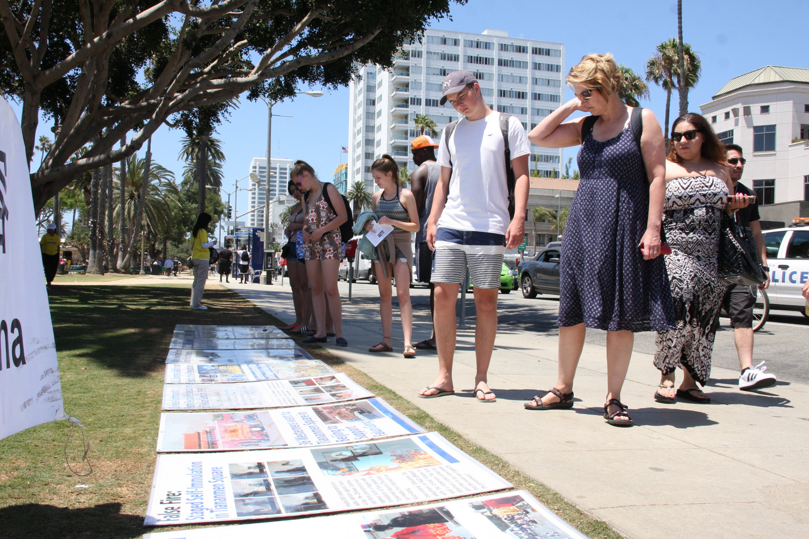 图5:圣莫尼卡海滩游客停下脚步关注中共“活摘”真相。 |