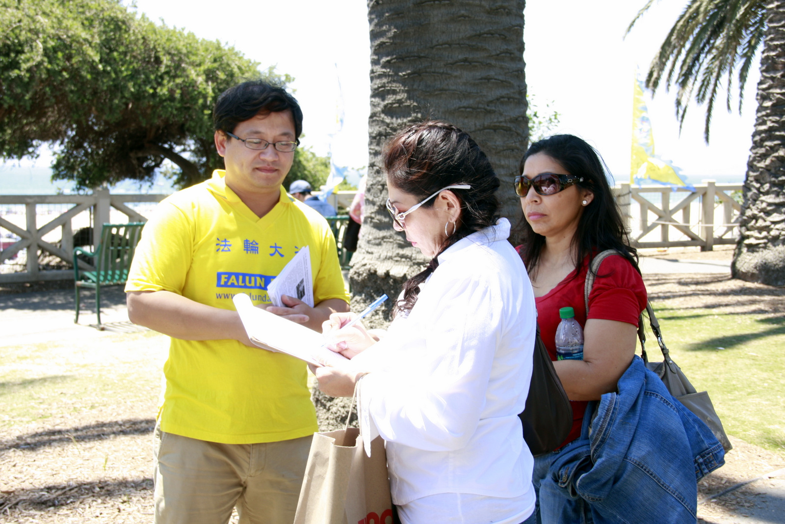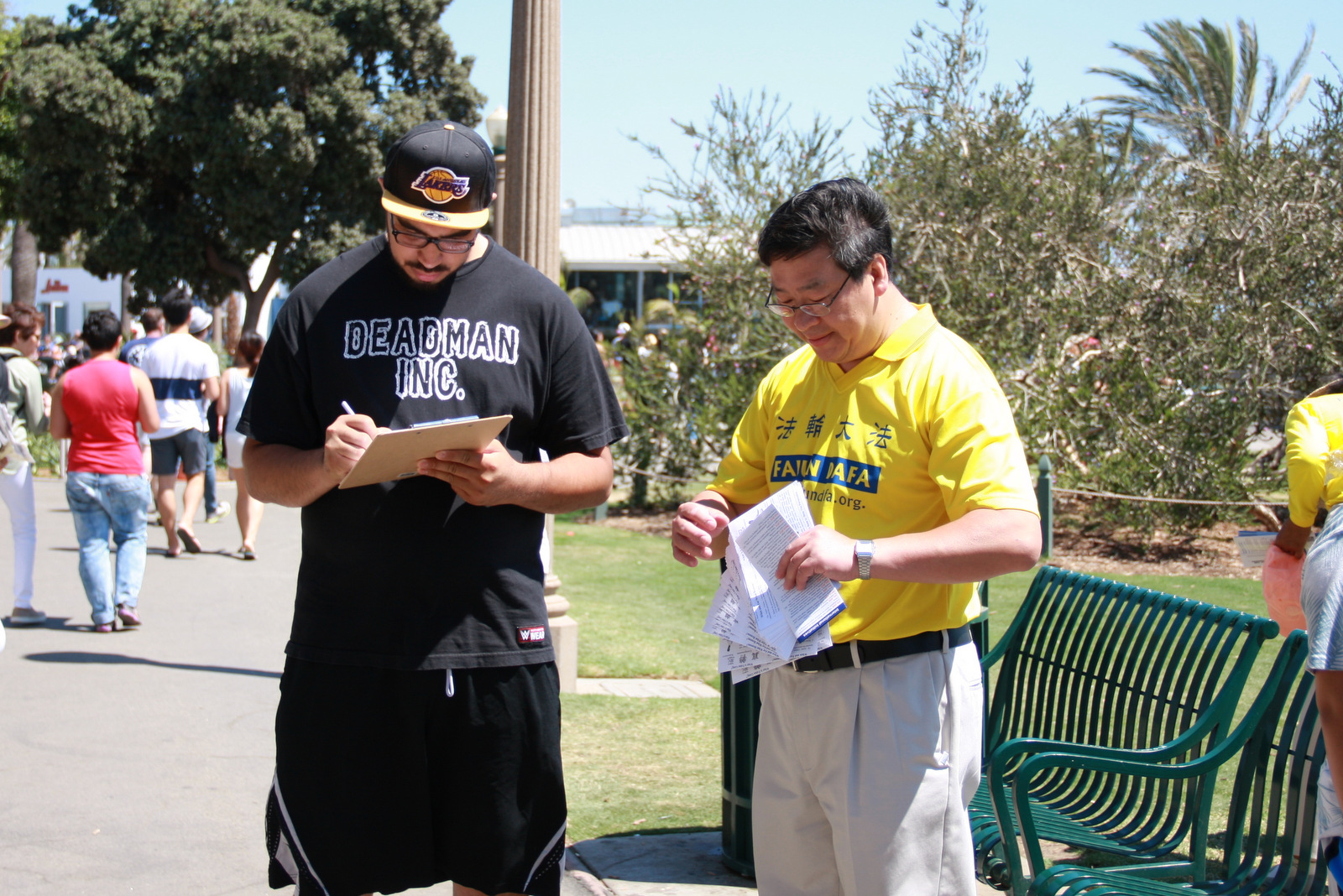 中共活摘法轮功学员器官正在被越来越多的人所知道。计程车司机Morris常年在圣莫妮卡码头拉客人。一年前他在法轮功学员的摊位上拿到一朵印有法轮大法好的莲花,并把莲花挂在车上,吸引了许多中国游客的注意力,向他发问,他就把自己听到的关于法轮功学员受迫害、器官被活摘的事讲给乘客听,很多中国游客还不相信。