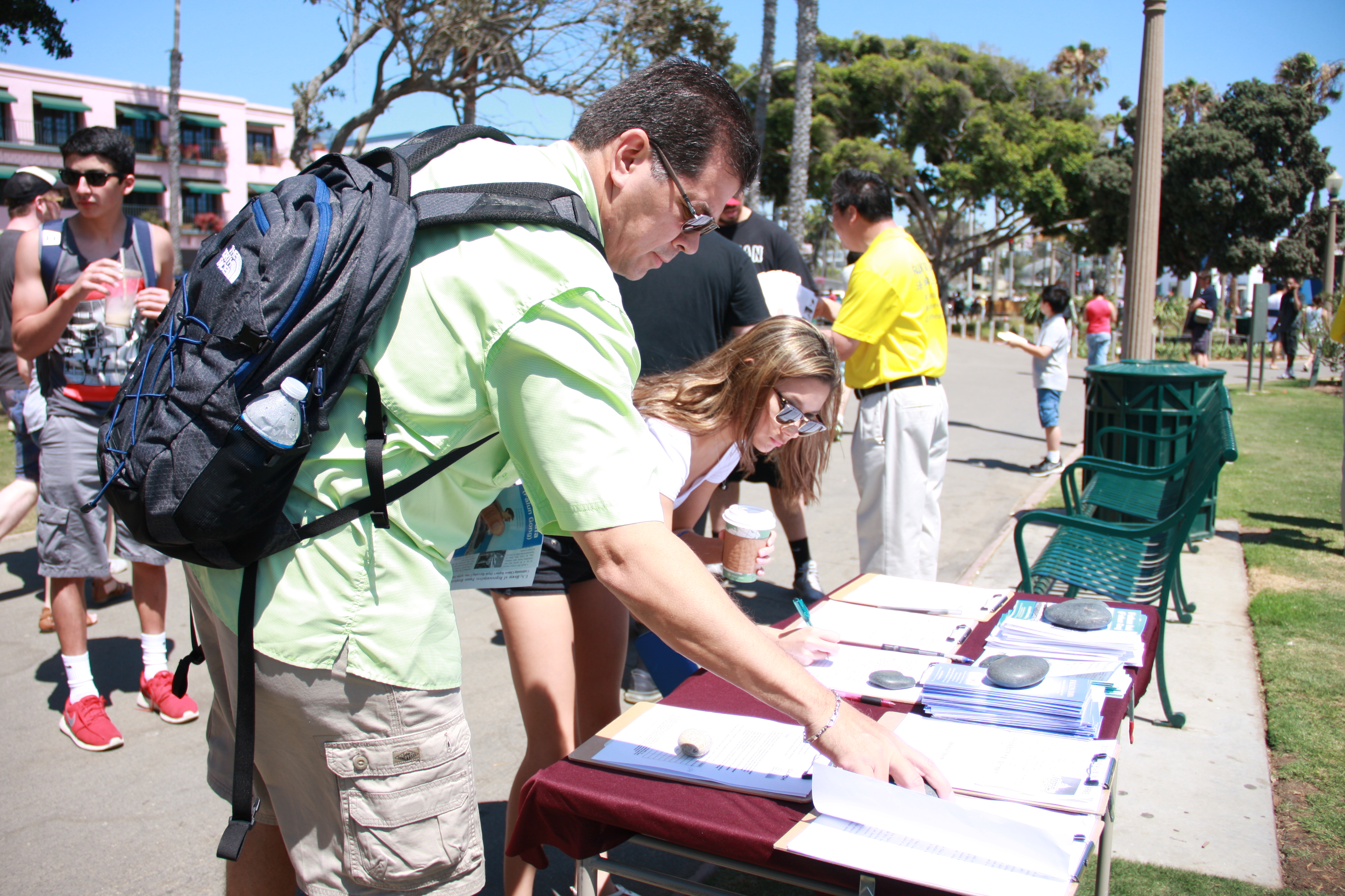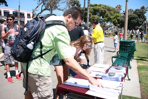 图6:法轮功学员向圣莫尼卡海滩游客解释中共活体摘除人体器官的事实。 |