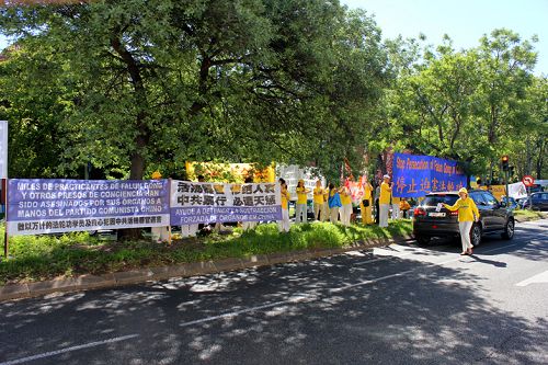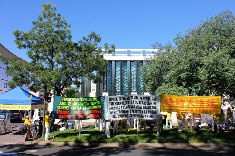 自一九九九年七月二十日开始,中共江氏集团公开践踏法律,开始了对数以百万计的法轮功学员进行绑架、关押、酷刑折磨甚至活摘器官,犯下了令人发指的反人类罪行。面对中共制造的血雨腥风,海内外法轮功学员始终坚持向民众讲述法轮功及迫害真相,走过了十七年和平理性反迫害的辉煌历程。 西班牙诉江案律师:对江泽民的国际审判即将到来 其他参与迫害者应悬崖勒马 西班牙诉江案律师伊格莱西亚斯·卡洛斯前来参加集会并发言。卡洛斯律师指出,中共对法轮功的迫害不仅违反了中国的法律,同时也违反了国际上的相关法律。对迫害元凶江泽民的国际审判即将到来。他奉劝那些曾参与迫害法轮功的中共各级人员了解真相,不要再参与江泽民集团的反人类罪行。 曾亲身遭受中共迫害的中国法轮功学员以亲身经历揭露中共在迫害法轮功中所犯下的反人类罪行,劝告那些仍在追随中共江泽民集团迫害法轮功的人员悬崖勒马,不要做江泽民反人类集团的殉葬品;同时奉劝那些曾经参与迫害的中共各级人员了解真相,摆脱中共邪灵的控制,站出来揭露迫害,将功补过。 集会现场悬挂的呼吁停止迫害的横幅标语和真相展板吸引了过往的行人,他们主动签名制止中共活摘器官,并询问还能为制止迫害做些什么。一位五十岁左右的西班牙男士签名制止活摘器官后询问还能为制止迫害做些什么。他赞扬法轮功学员为维护人权所做的努力。他说,我们全世界就好象是一个家庭,不管哪里发生了侵犯人权的暴行,我们都不能坐视不管。 一位路过的女士主动和法轮功学员交谈,关切在中国发生的迫害。她在制止活摘器官的签字簿上签名后表情凝重,希望为制止迫害提供更多的帮助。 在中共驻西班牙大使馆门前马路上偶然停泊的车辆,有的开窗索要真相资料,有的鸣笛示意法轮功学员“加油”。