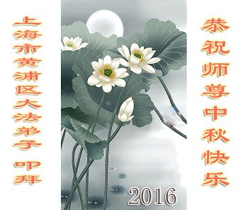 慈悲伟大的师尊您好!恭祝师尊中秋节快乐! 每逢佳节倍思亲。光阴似箭,转眼又是一个月圆之日,弟子仰望师恩,说不完道不尽师恩的深情。 在这亘古未有的伟大时刻,我们一定会珍惜,不懈怠多救众生,完成助师正法的使命!借此机会我们特转达我们在八月二十八日上午打电话讲真相被救度的一位山西(化名叫刘欢) 的众生的重托:向伟大的师尊问好! 上海讲真相三人小组全体大法弟子叩谢师恩 二零一六年八月三十日 上海市松江、长宁、普陀、静安、浦东新区大法弟子恭祝师尊中秋节快乐!