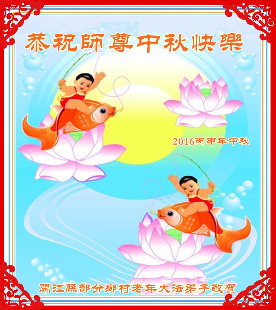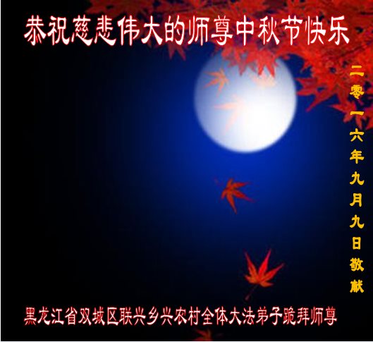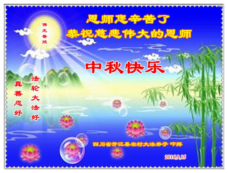师尊您好! 弟子一定多学法,实修自己的一思一念,努力做好三件事报答恩师救度之恩,走好最后的路。 德阳市旌阳区八角井锁双圣村全体大法弟子敬上 二零一六年九月八日 山东泰安市农村大法弟子恭祝恩师中秋节快乐!