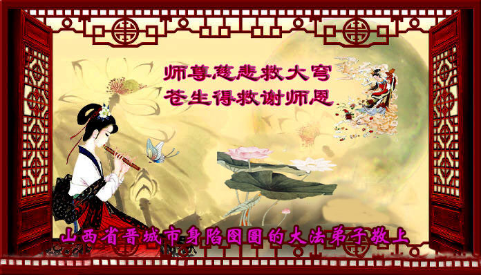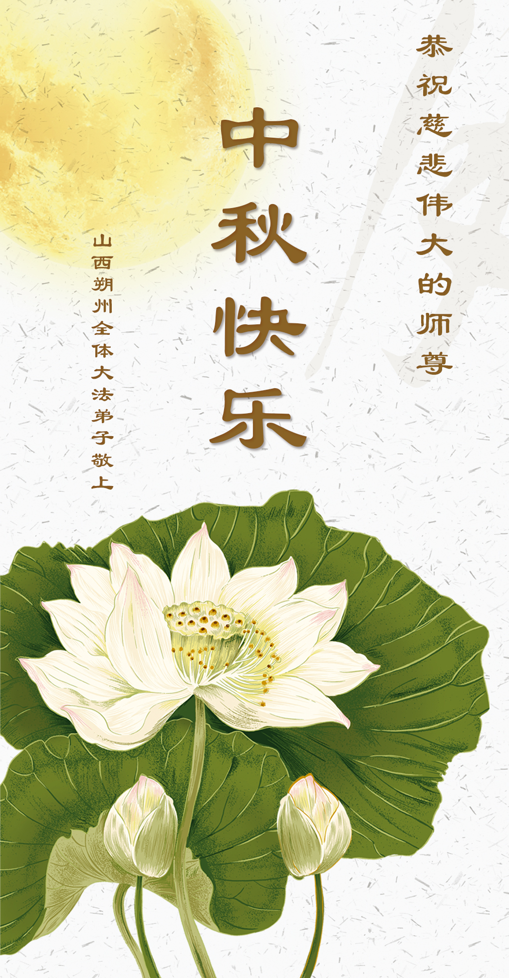 二十年的修炼之路,我们时时刻刻感到师父就在我们身边,这就是最大的幸福。 有恩师陪伴,我们义无反顾来到凡间 有恩师陪伴,我们风风雨雨走到今天 有恩师陪伴,我们无畏尘世的艰险 有恩师陪伴,我们藐视红魔的凶残 有恩师陪伴,我们冒着酷暑与严寒 有恩师陪伴,真相把城乡洒遍 有恩师陪伴,我们踏平充满荆棘的沟坎 有恩师陪伴,我们跨越了万象丛生的险滩 有恩师陪伴,我们天胆把诉状寄到两高院 有恩师陪伴,我们必将送江鬼接受正义的审判 有恩师陪伴,我们熬过了漫长的严冬 有恩师陪伴,我们即将迎来法正人间的壮观 放眼看去,得救的众生欢呼雀跃 “法轮大法好”的声音充满天上人间 真善忍的法理必光耀寰宇 神州大地上处处开满了纯洁的梅莲 我们的心与恩师紧紧相连,直至永远 今天我们向明慧投递这小小的便笺,让明慧帮我们转达最深的祝愿,山西省阳泉市平定县全体大法弟子齐声祝愿我们慈悲伟大的师父中秋快乐,我们由衷说一句师父节日好!师父辛苦了!盼师父早日回国! 山西省晋城市身陷囹圄的大法弟子恭祝师尊中秋快乐!