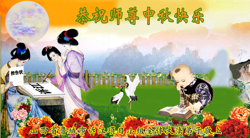 历史新的一页已经翻开,正法洪势迅猛向前推進,诉江大潮风起云涌。我们一定要珍惜这伟大的历史时刻,真正成熟起来,积极投身到诉江大潮之中,把迫害大法、迫害大法弟子的人间首恶推上历史的审判台,继续做好三件事,形成强大的整体,尽心尽力的救人,完成我们神圣的使命,圆满随师还。 调笑令•诉江 诉江,诉江, 万张诉状飘扬。 妖蟾寝食难安, 全球声援除患。 患除,患除, 众生雀跃欢呼。 山西省晋城市诉江项目小组大法弟子合十跪拜 山西省晋城市项目小组全体大法弟子恭祝师尊中秋快乐!