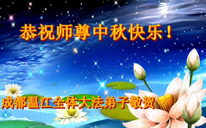 尊敬的师父,您好! 中秋节即将来临,我们一家人恭祝您中秋快乐!感谢您的慈悲救度,我们会持之以恒的做好三件事,不辜负您的期望。 成都一大法弟子之家全体家人敬祝 四川省成都净莲学法组全体弟子恭祝师尊中秋节快乐!