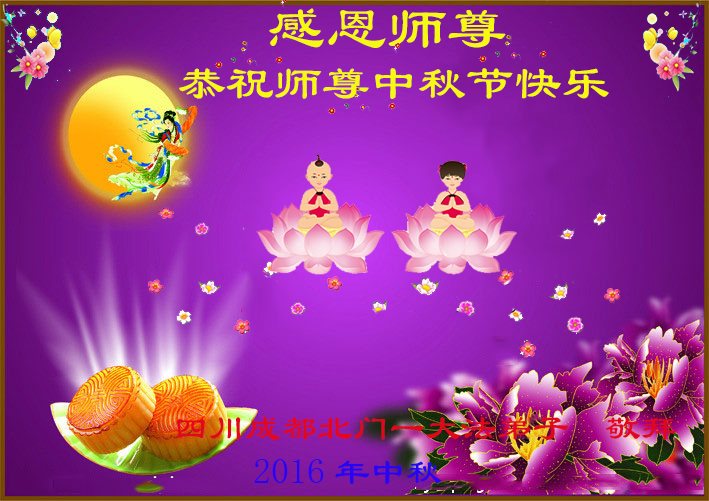我们都江堰全体大法弟子及家人恭祝师父中秋快乐! 在佳节之际我们都很想念师父,望师父早日回到中国大陆与弟子团聚,师父您辛苦了! 感恩师父辛苦付出,慈悲救度,慈悲加持,慈悲点化,慈悲呵护! 千言万语汇成一句话:恭祝师父中秋快乐!在最后时间不多,我们会更加精進,努力做好师尊教诲的三件事,多学法,学好法,遇事向内找,修好自己,多多救人,完成自己的大愿,让师尊多一份欣慰,少一份操劳。再次感恩慈悲伟大的师父! 都江堰全体大法弟子及家人敬上 2016.9.8 四川省成都市都江堰市一位老年大法弟子恭祝师父中秋快乐!