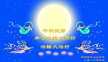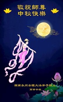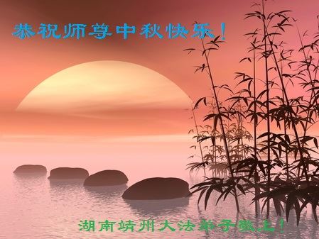中华中秋佳节近 亿徒遥拜谢恩师 师尊威德正宇宙 苍穹层宇换新颜 层层神佛跟师走 签下誓约要兑现 师尊一再给机会 损伤人体除群魔 湘岳洞庭众弟子 三件大事项目多 唯祝师尊稍宽心 阖家中秋赏月圆 湖南省全体大法弟子恭祝师尊中秋节快乐!