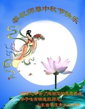 尊敬慈悲的师尊您好!辛苦了! 中秋节是团圆的日子,此刻弟子们更加思念慈悲伟大的师尊,是您给予了弟子们重生的一切,千言万语难以表达师父对弟子们的大恩大德。我们学法小组全体人员,都在尽自己的最大努力,做好三件事。正法已接近尾声,要救更多的众生,让师尊少一份操劳,多一份欣慰!祝师尊中秋节快乐! 山东省青岛大法弟子夫妻二人恭祝师父中秋快乐!