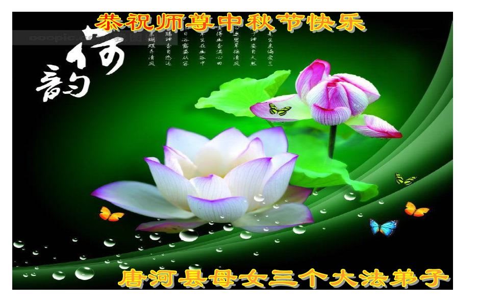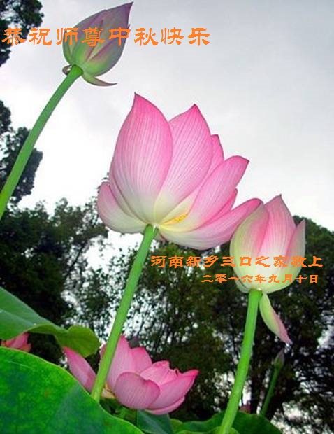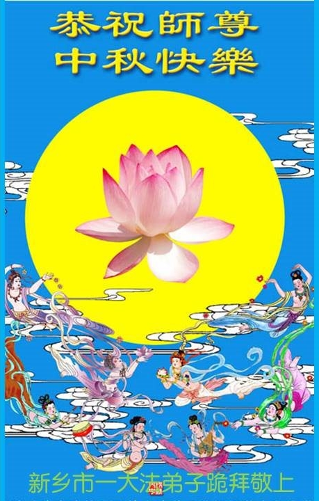 师尊您辛苦了: 值此中秋佳节即将来临之际,河南省周口市鹿邑县大法弟子恭祝师尊中秋节快乐!在当今大陆这个人人忙着挣钱、道德急速下滑的邪*党-社会里,同修们冒着酷暑讲真相救度世人,接下来我们又将要冒着严寒出去救人了——我们格外珍惜师尊用巨大的承受换来的时间,师尊您辛苦了。 河南省洛阳市大法弟子恭祝慈悲伟大的师父中秋节快乐!