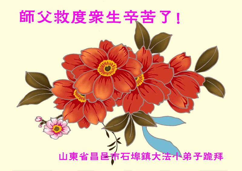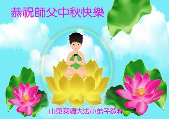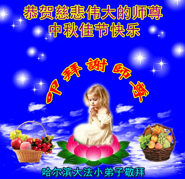 师父为小弟子操尽了心,师父时刻呵护着小弟子。小弟子一定听师父您的话,小弟子在任何环境中都一定尽力按宇宙大法真、善、忍的标准来严格要求自己。处处为别人着想,做个道德高尚、合格的大法弟子。谢谢伟大的师父慈悲苦度弟子! 小弟子叩拜伟大师父!再叩拜!合十! 山东聊城全体大法小弟子恭祝师尊中秋快乐!