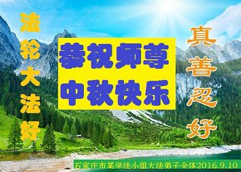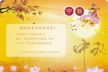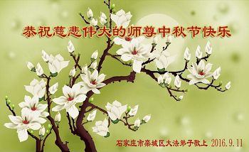 弟子决心在以后不多的时间里勇猛精進,真正实修自己救更多的人,不辜负师父的慈悲苦度,让师父多一些欣慰! 河北石家庄大法弟子恭祝师父中秋节快乐!