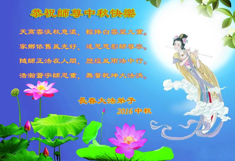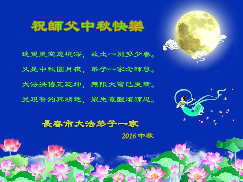 长春大法弟子及家属想念师尊!恭祝慈悲伟大的师尊中秋佳节快乐! 二零一六年九月九日 长春市大法弟子及家属敬上 |