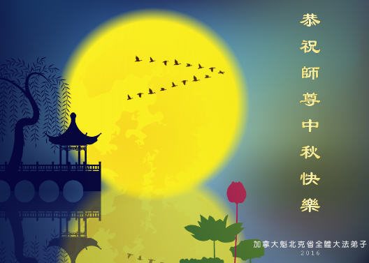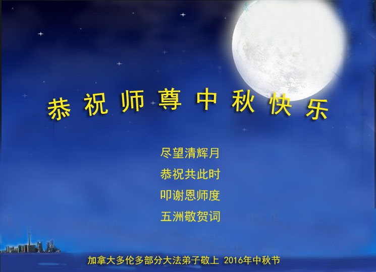 【明慧网二零一六年九月十四日】 加拿大多伦多全体大法弟子恭祝慈悲伟大的师尊中秋节快乐!