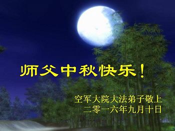 团圆节日即将来临,中国人民防空系统的众弟子倍感思念恩师;我们一定走好最后的路,做好三件事,不辜负师尊救度之恩。 中国人民防空系统的大法弟子 2016-09-10 原江苏省南京军区一转业干部大法弟子恭祝伟大的师尊中秋节快乐!