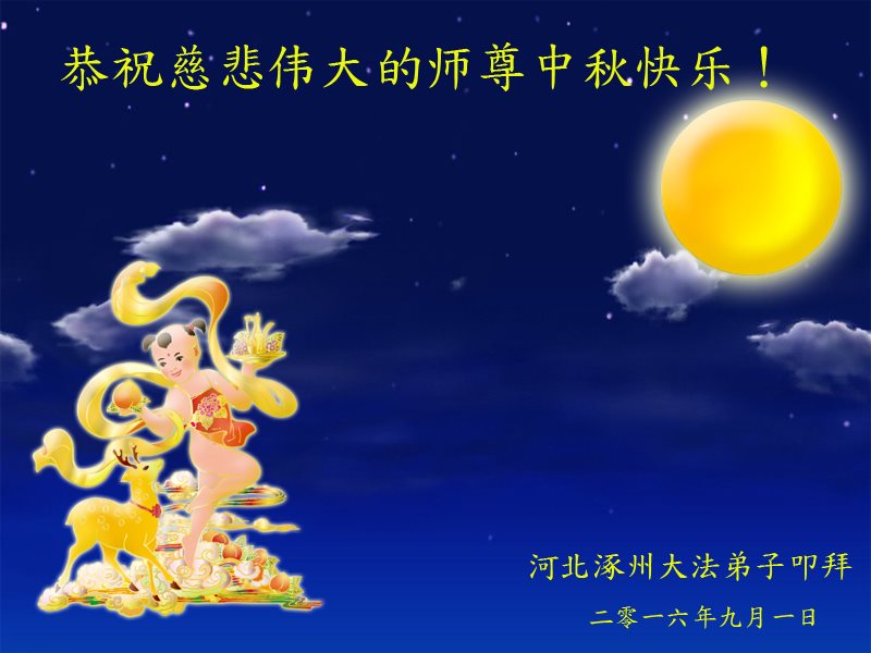 【明慧网二零一六年九月十四日】 河北省保定市涿州市一资料点大法弟子恭祝师尊中秋快乐!