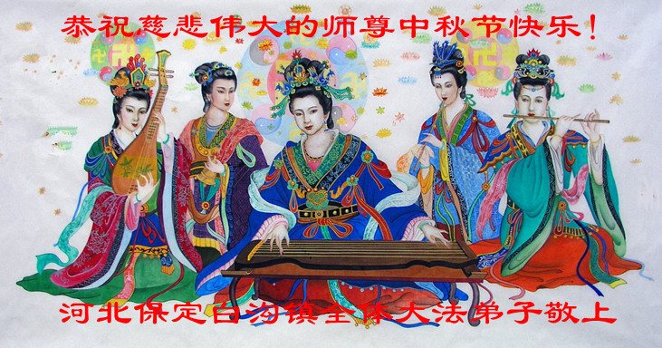 我们盼望您带领神韵艺术团早日回国,巡演全国各地,让灿烂辉煌的神传文化、传统文化取代中国的流氓文化、暴力文化、谎言文化、魔鬼文化、杀人文化、邪恶文化和反传统文化。感谢您把造就无量大穹、造就万事万物、造就无量众生的宇宙大法--之根本“真善忍”传给世人、各界众生、各界佛、道、神!感谢您把我们从病魔中、从败坏中、从迷茫中出来! 河北保定大法弟子三人小组恭祝慈悲伟大的师尊中秋节快乐!