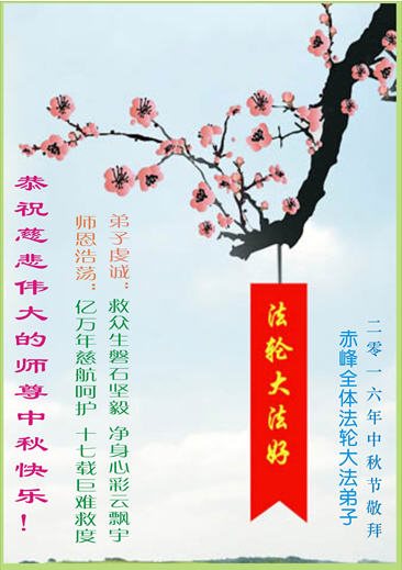 中秋节叩拜慈悲伟大的恩师!赤峰全体大法弟子感谢师尊的慈悲呵护,帮助弟子救度众生,完成史前大愿。大法弟子为报答慈悲伟大的师尊的救度,坚定的走正路,要师父所要的,做好弟子该做的一切。形成坚不可摧的整体,解体迫害,救度众生。 内蒙古自治区赤峰全体大法弟子恭祝师尊中秋快乐!